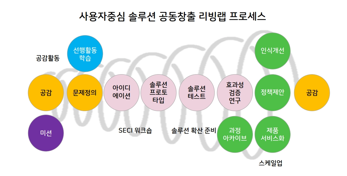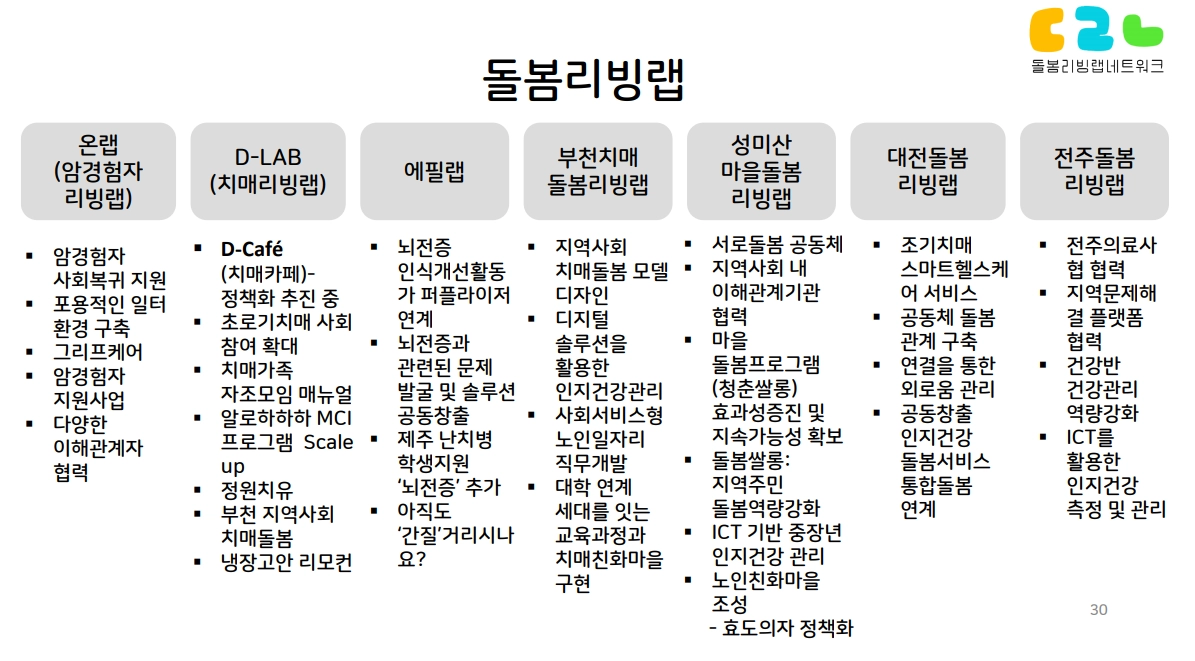 D-LAB(치매 리빙랩): 지역 사회에서 당사자가 직접 참여하여 문제를 해결하는 실무형 모델.