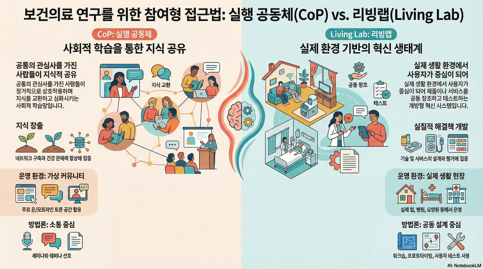 새로운 접근법의 필요성: 이에 따라 대상자를 위한(for) 연구가 아니라 대상자와 함께(with) 하는 새로운 협력적 참여 방법론이 필요해졌으며, 보건의료 분야에서 이를 해결하기 위해 가장 인기 있게 도입된 두 가지 접근법이 바로 **'실행 공동체(CoP)'**와 **'리빙랩(Living Lab)'**입니다.