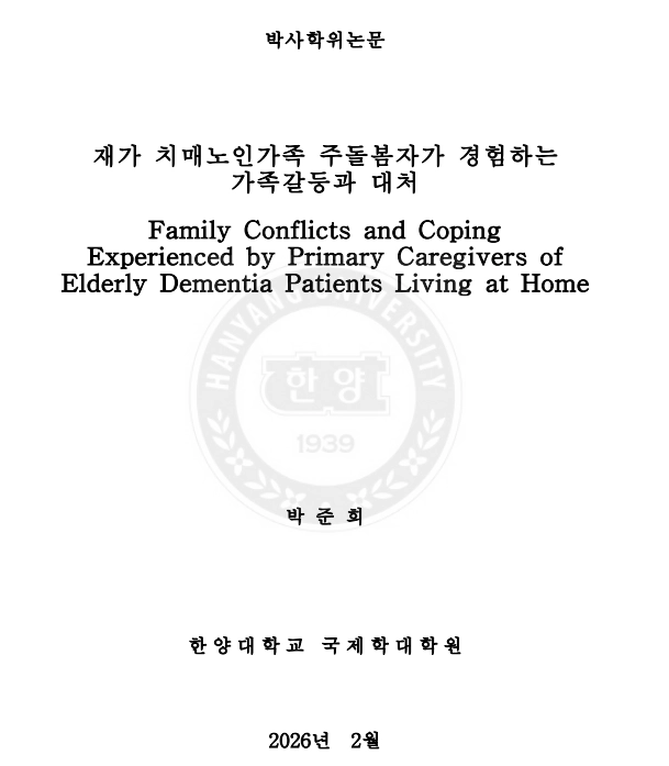 논문명: 재가 치매노인가족 주돌봄자가 경험하는 가족갈등과 대처 (Family Conflicts and Coping Experienced by Primary Caregivers of Elderly Dementia Patients Living at Home)