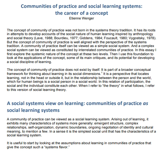 제목 (Title): Communities of practice and social learning systems: the career of a concept