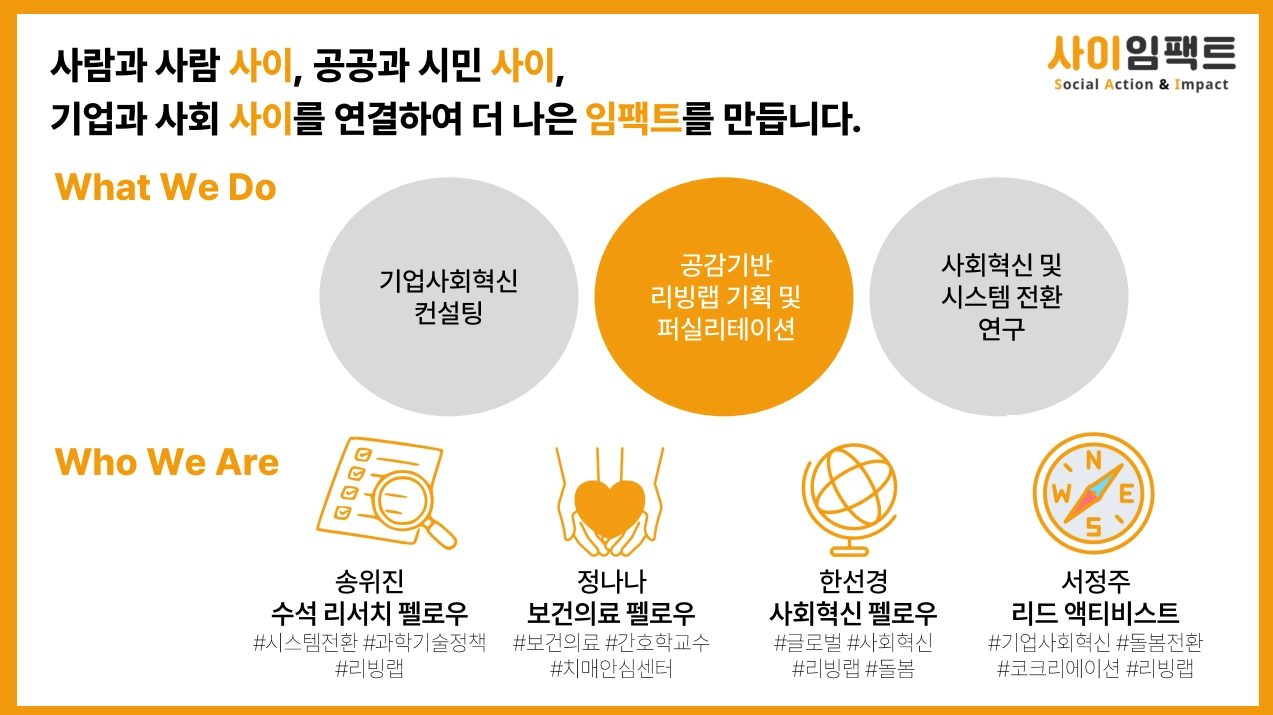 사회혁신 조직(사이임팩트) 설립 계획을 공유하며, 앞으로도 돌봄 리빙랩, 기업사회혁신, 현장 중심의 사회문제 해결을 지속할 의지를 표명.